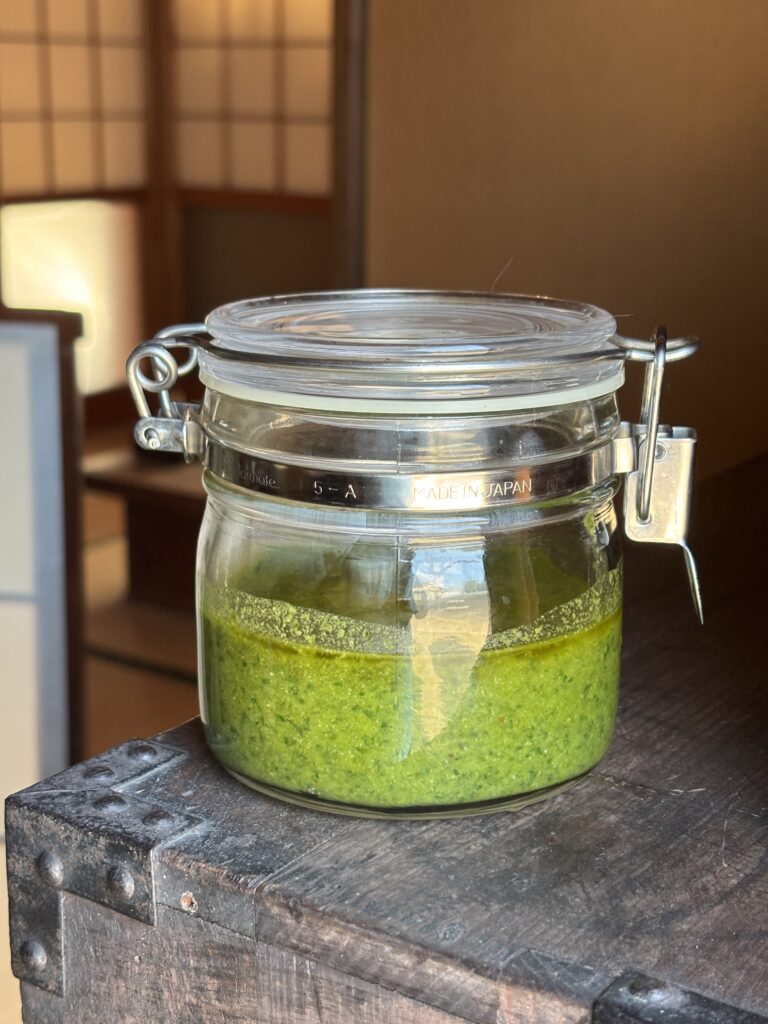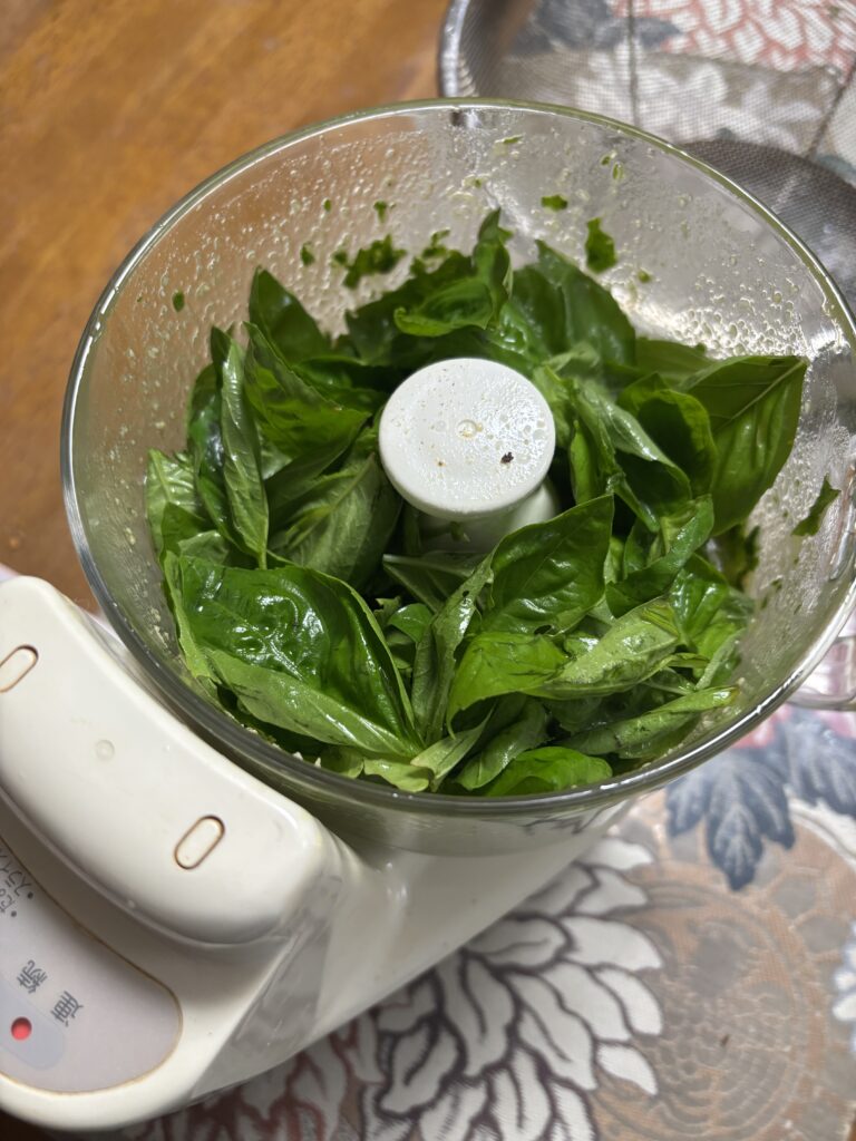自家製ジェノベーゼソース ごはん 2025.09.15 家の庭に思いつきで植えたバジルの苗が、夏の間に見事に育ち、周囲の青じそやネギをなぎ倒して収拾がつかなくたったので思い切って一気に収穫した。時々思いついたように、数枚のバジルの葉っぱをちぎってきては、ピザに乗せたり、カプレーゼにしたりとややおしゃれ風に使っていたが、そんなもんでは追いつかないほどに、この夏の暑さでボーボーに育ってしまったのである。そこで今日は朝から収穫&ジェノベーゼソースづくり。 実は数年前、産直市で買ったバジルを使って家でジェノベーゼソースを作ったことがあるのだが、驚くほどマズイソースが出来上がってしまったことがある。パスタでもピザでもジェノベーゼソースは大好きなだけにショックが大きく、それ以来、おとなしくキュービーさんやS&Bさんの市販品を使うことにしていた。(輸入品はクセが強すぎて個人的には苦手。)一応リベンジでもあるので、ネットで信頼のおけるレシピを片っ端から探し、作り方もきっちり調査。いろんなレシピがあるので、これが正解なのかどうかはわからないが、今回はめちゃくちゃ美味しいのができた。これにはびっくりした。松の実をフライパンで炒ってから使ったのと、ソースの段階では塩と粉チーズを入れなかったのがよかったのかもしれない。塩分により、かえって風味や状態の劣化がすすんでフレッシュさがキープできず、チーズの風味も生かせないので、ソース自体には加えず、調理段階(パスタとからめるときなど)に味付けするのがおすすめ、と書いてあるものを参考にした。あと、オリーブオイルもわりといいやつを使ったので、それもよかったのかも。 ◆備忘録的に材料メモ ・バジルの葉100g・松の実20g フライパンで炒って冷ましておく・にんにく (小)1かけ・エクストラバージンオリーブ油 180ml 今回はミキサーではなく、フードプロセッサーを使用。オリーブオイルに、にんにくと松の実を入れてフードプロセッサーでなめらかにしたら、バジルの葉を入れて、ガーーーーッと。パスタにしたり、野菜にかけたりするときに粉チーズと塩こしょうで味をととのえる。 お昼にパスタにしたのだが、バジルとチーズの風味がめちゃくちゃよく、我ながら衝撃のおいしさだった。これこれ!これが食べたかったのよ。来年の夏もまたバジルが収穫できたら絶対作ろう。